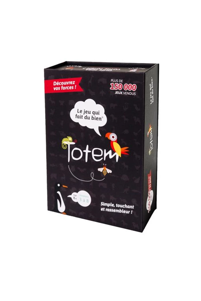 Totem est tout simplement un OLNI (Objet Ludique Non identifié) découvert. Il n’a pas vocation compétitive ou coopérative. Il vient juste se poser là, pour vous donner des outils incroyables pour un déferlement d’amour. Ici, vous allez devoir déterminer le totem de chacune des personnes assises autour de la table en l’identifiant au travers d’un animal et d’une qualité. Le cours du jeu fera le reste. Émotions garanties.
